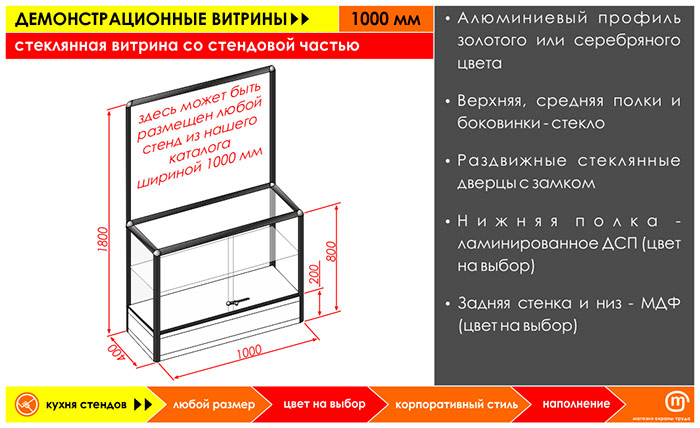Предлагаем стеклянные витрины со стендовой частью для демонстрации СИЗ различной ширины - 600, 1000 и 1200 мм. Высота всех витрин составляет 800 мм. Изготовливаются витрины из алюминиевого профиля золотого или серебряного цвета, верхняя, средняя полки и боковинки - стекло, раздвижные стеклянные дверцы с замком, нижняя полка изготавливается из ламинированного ДСП (цвет на выбор), задняя стенка и низ - из МДФ