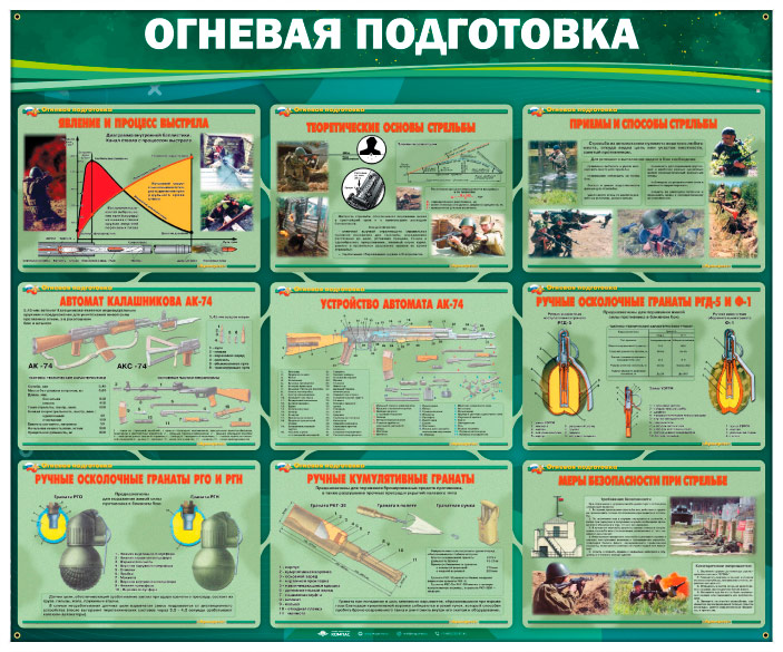 Стенд «Огневая подготовка» (VU-02) разработан в соответствии с Федеральным законом «О воинской обязанности и военной службе», Положением о подготовке граждан Российской Федерации к военной службе, Концепцией патриотического воспитания граждан РФ, тематическим планом раздела ОБЖ «Основы военной службы». На стенде раскрываются теоретические основы стрельбы, явление и процесс выстрела, приемы и способы стрельбы, предназначение и устройство РПК-74 и АК-74, ручных осколочных гранат РГД-5 и Ф-1, а также гранат РГО и РГН, меры безопасности при стрельбе.