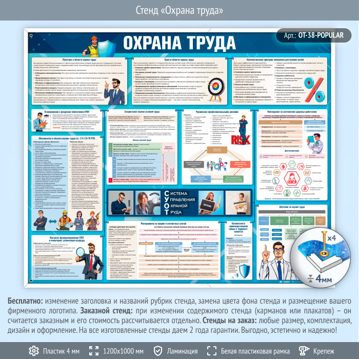 Стенд «Охрана труда» (OT-38) помогает организовать эффективную систему управления охраной труда и обеспечивает работников актуальной информацией для повышения безопасности на рабочем месте.