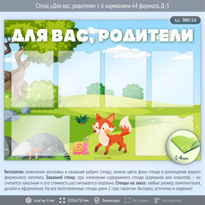 Стенд «Для вас, родители» с 6 карманами А4 формата (DOU-3.6) в Великом Новгороде купить