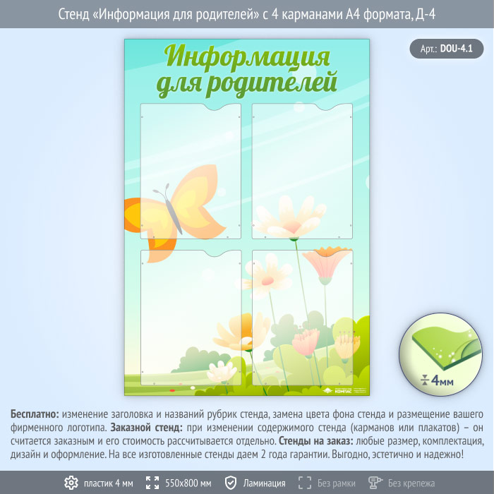 Стенд «Информация для родителей» с 4 карманами А4 формата (DOU-4.1) в Великом Новгороде купить