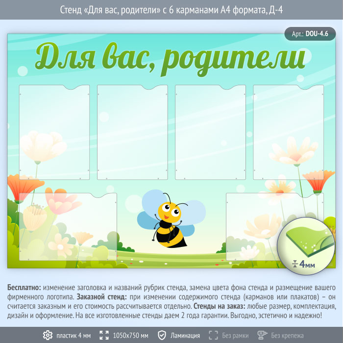 Стенд «Для вас, родители» с 6 карманами А4 формата (DOU-4.6) в Великом Новгороде купить