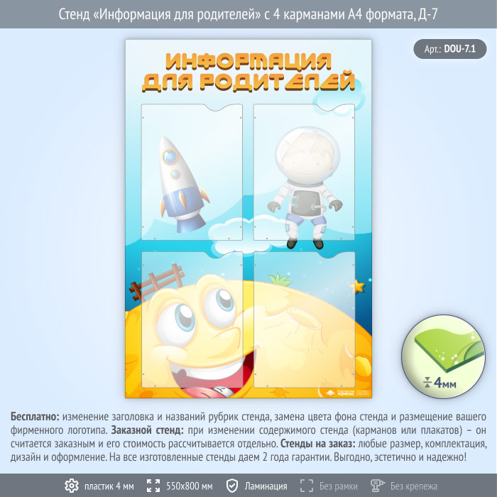 Стенд «Информация для родителей» с 4 карманами А4 формата (DOU-7.1) в Великом Новгороде купить