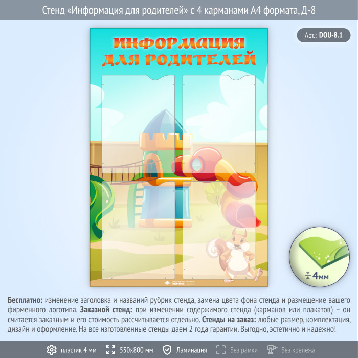 Стенд «Информация для родителей» с 4 карманами А4 формата (DOU-8.1) в Великом Новгороде купить