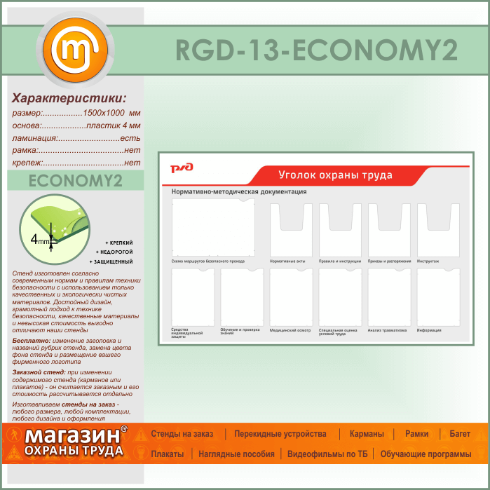 Стенд «Уголок охраны труда» с 1 плоским карманом А3 формата, 6 плоскими и 4 объемными карманами А4 формата (RGD-13-ECONOMY2) в Великом Новгороде купить