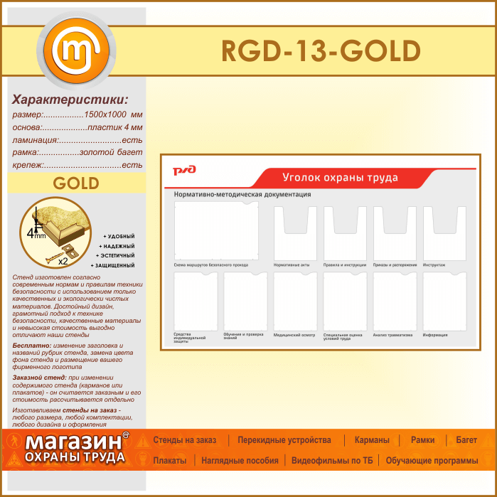 Стенд «Уголок охраны труда» с 1 плоским карманом А3 формата, 6 плоскими и 4 объемными карманами А4 формата (RGD-13-GOLD) в Великом Новгороде купить