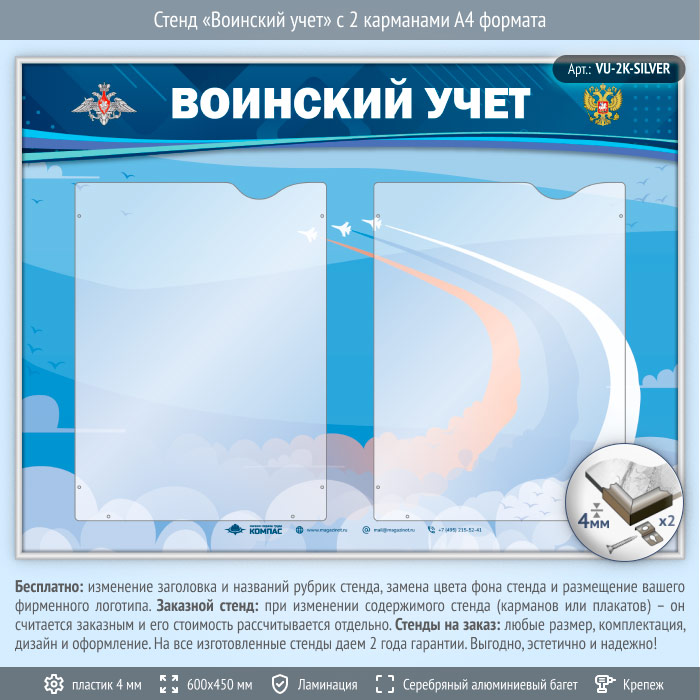 Стенд «Воинский учет» с 2 карманами А4 формата (VU-2K-SILVER) в Великом Новгороде купить