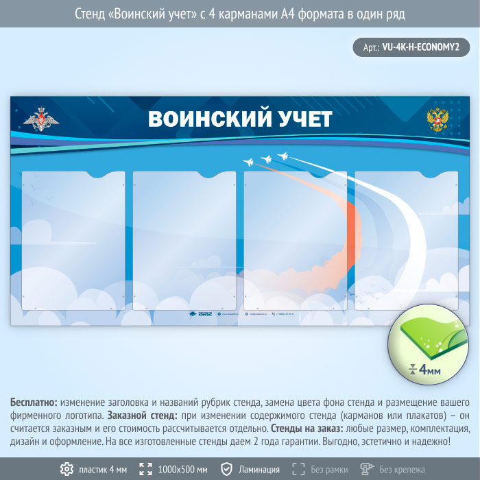 Стенд «Воинский учет» с 4 карманами А4 формата в один ряд (VU-4K-H-ECONOMY2) в Великом Новгороде купить