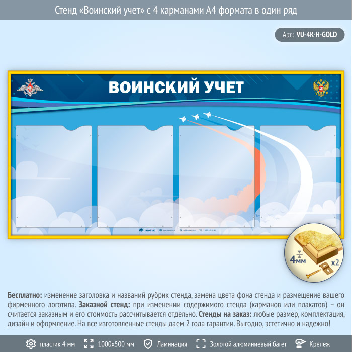 Стенд «Воинский учет» с 4 карманами А4 формата в один ряд (VU-4K-H-GOLD) в Великом Новгороде купить