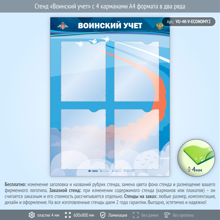 Стенд «Воинский учет» с 4 карманами А4 формата в два ряда (VU-4K-V-ECONOMY2) в Великом Новгороде купить