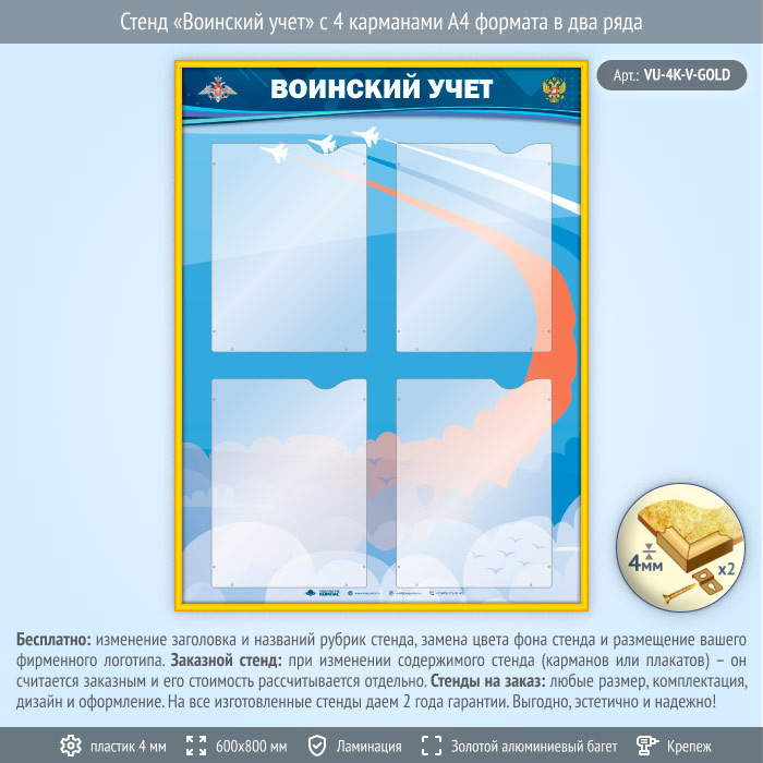 Стенд «Воинский учет» с 4 карманами А4 формата в два ряда (VU-4K-V-GOLD) в Великом Новгороде купить