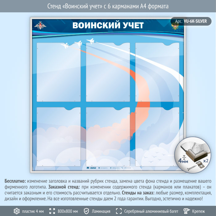 Стенд «Воинский учет» с 6 карманами А4 формата (VU-6K-SILVER) в Великом Новгороде купить