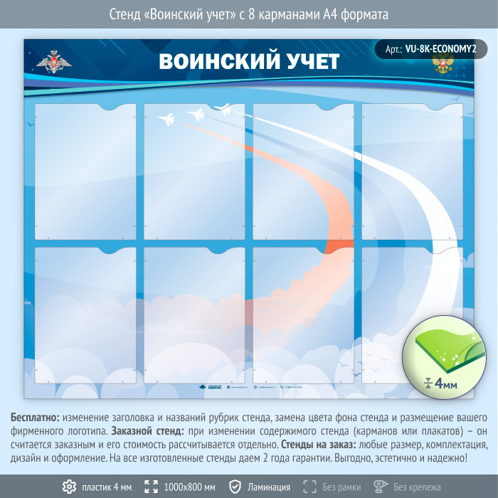 Стенд «Воинский учет» с 8 карманами А4 формата (VU-8K-ECONOMY2) в Великом Новгороде купить