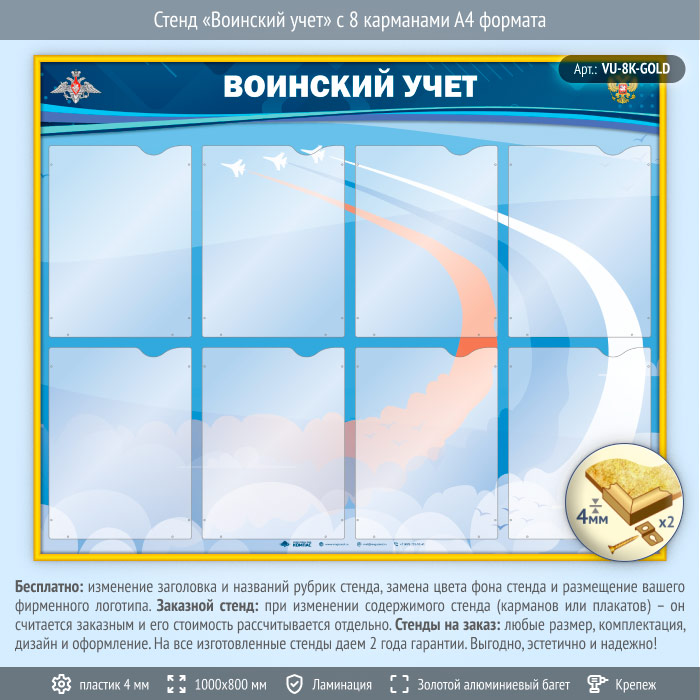 Стенд «Воинский учет» с 8 карманами А4 формата (VU-8K-GOLD) в Великом Новгороде купить