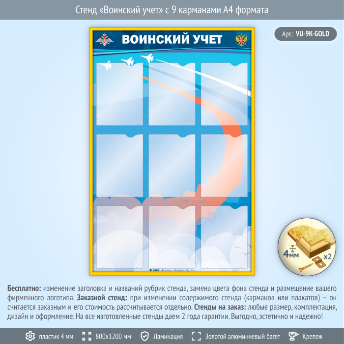 Стенд «Воинский учет» с 9 карманами А4 формата (VU-9K-GOLD) в Великом Новгороде купить