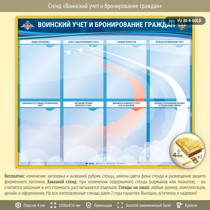 Стенд «Воинский учет и бронирование граждан» с 8 карманами А4 формата (VU-8K-R-GOLD) в Великом Новгороде купить