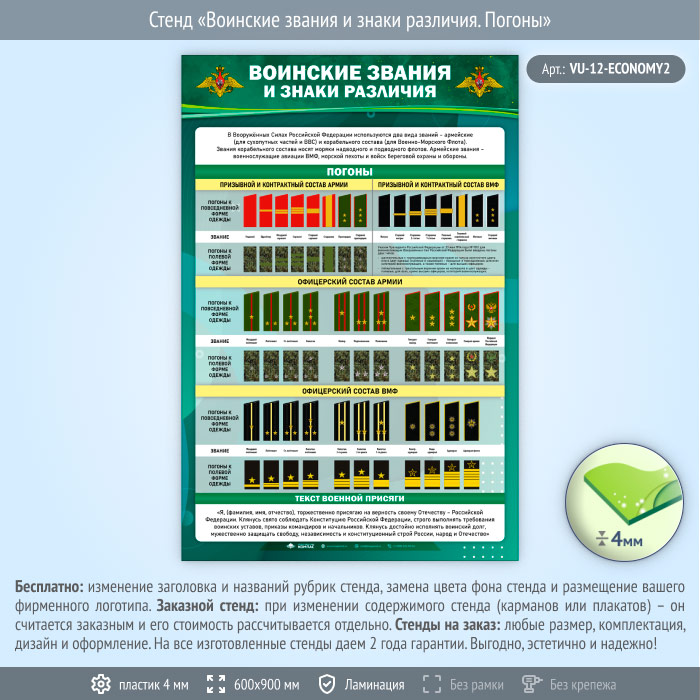Стенд «Воинские звания и знаки различия. Погоны» (VU-12-ECONOMY2) в Великом Новгороде купить
