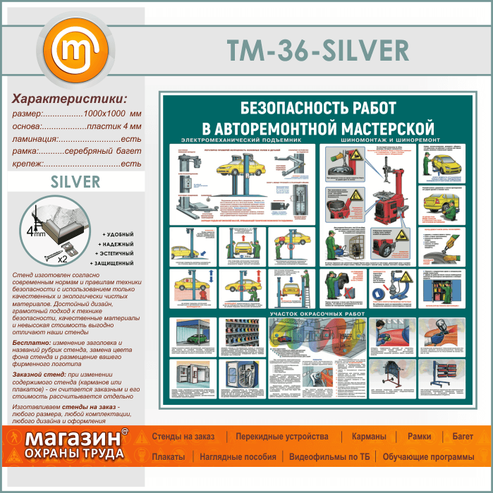 Стенд «Безопасность работ в авторемонтной мастерской» (TM-36-SILVER) в Великом Новгороде купить