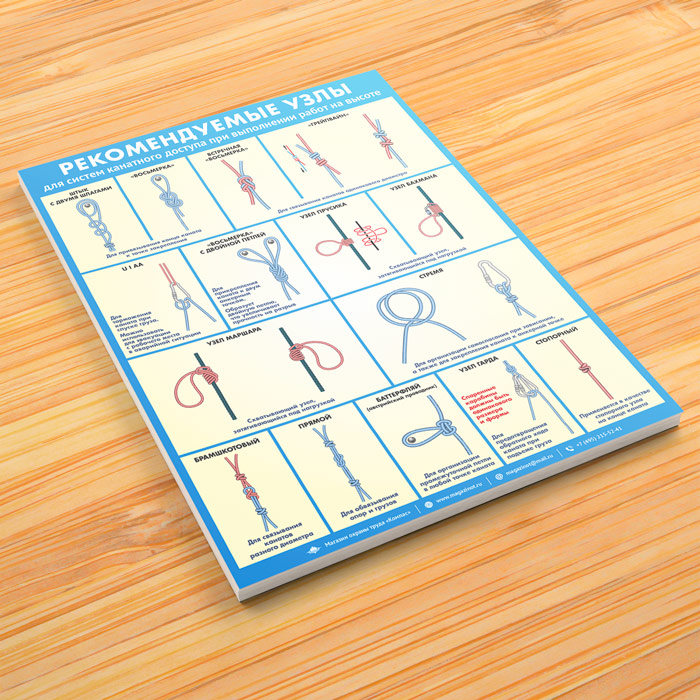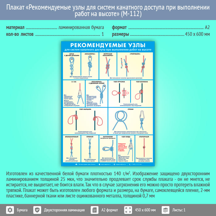 Плакат «Рекомендуемые узлы для систем канатного доступа при выполнении работ на высоте» (М-112, ламинированная бумага, А2, 1 лист) в Великом Новгороде купить