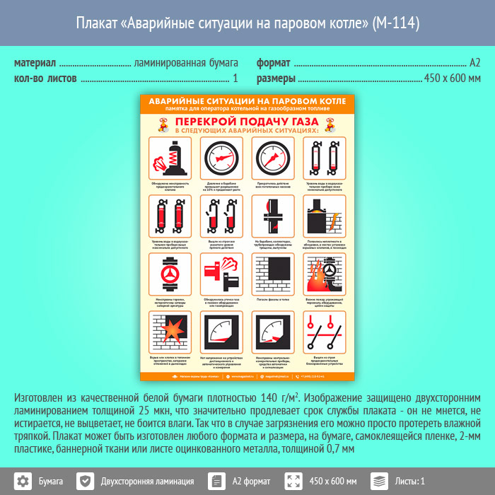 Плакат «Аварийные ситуации на паровом котле» (М-114, ламинированная бумага, А2, 1 лист) в Великом Новгороде купить
