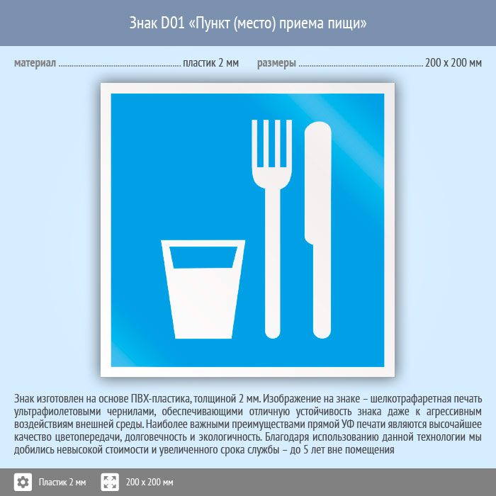 Знак D01 «Пункт (место) приема пищи» (пластик, 200х200 мм) в Великом Новгороде купить