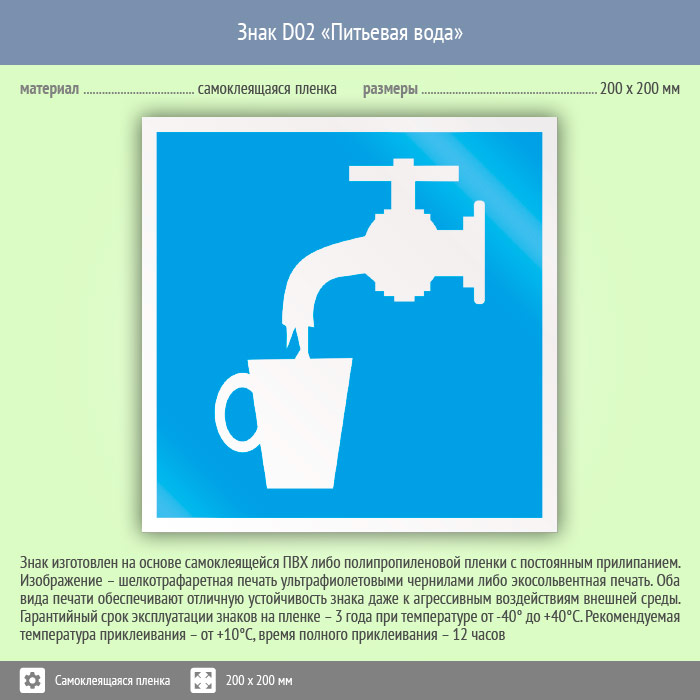 Знак D02 «Питьевая вода» (пленка, 200х200 мм) в Великом Новгороде купить