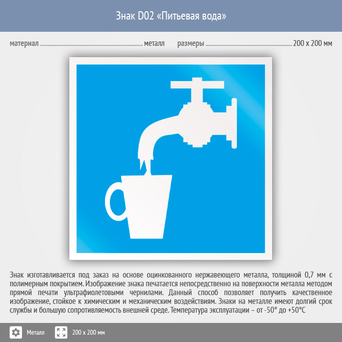 Знак D02 «Питьевая вода» (металл, 200х200 мм) в Великом Новгороде купить