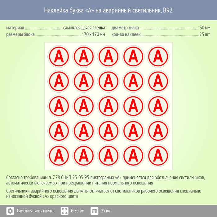 Наклейка буква «А» на аварийный светильник, B92 (пленка, диаметр 30 мм, блок 25 штук, 170х170 мм) в Великом Новгороде купить