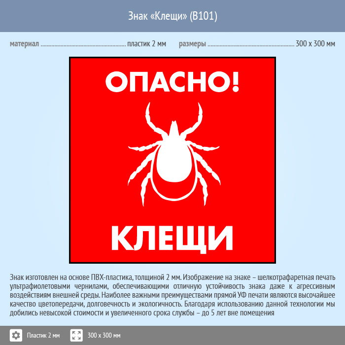 Знак «Опасно! Клещи», B101 (пластик, 300х300 мм) в Великом Новгороде купить