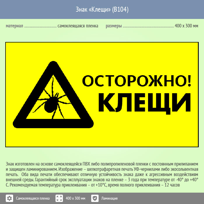 Знак «Осторожно! Клещи», B104 (пленка c ламинированием, 300х200 мм) в Великом Новгороде купить