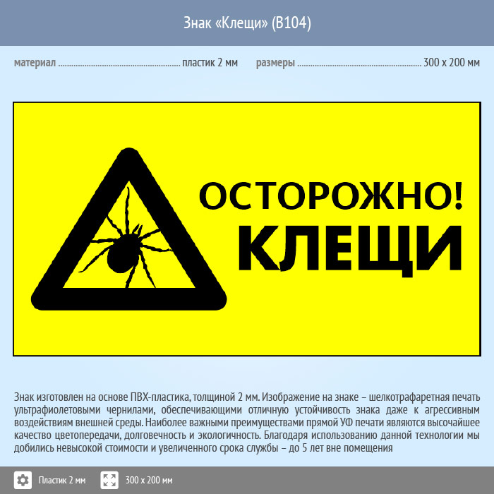 Знак «Осторожно! Клещи», B104 (пластик, 400х300 мм) в Великом Новгороде купить