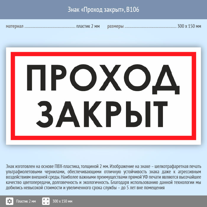 Знак «Проход закрыт», B106 (пластик, 300х150 мм) в Великом Новгороде купить