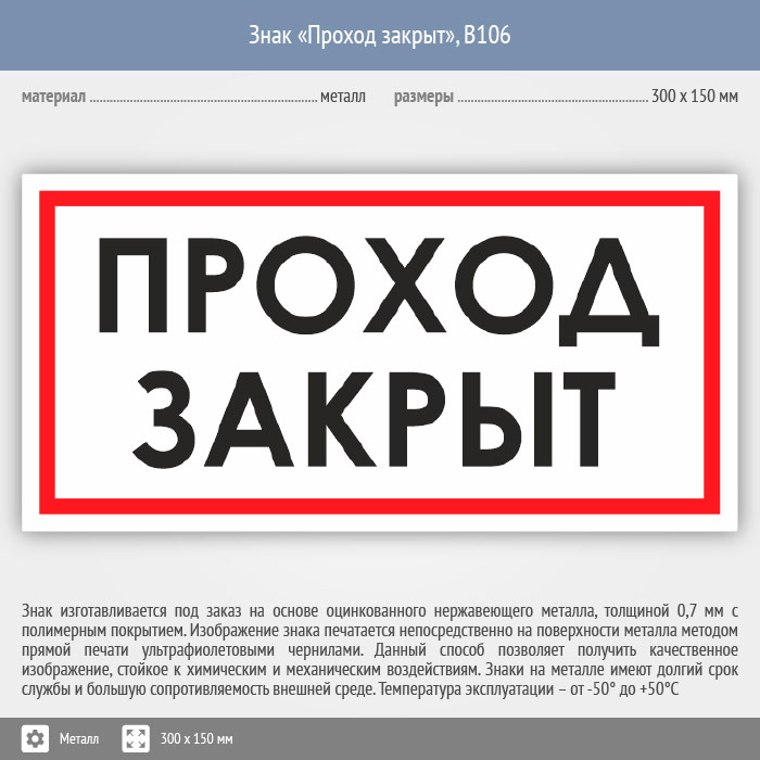 Знак «Проход закрыт», B106 (металл, 300х150 мм) в Великом Новгороде купить
