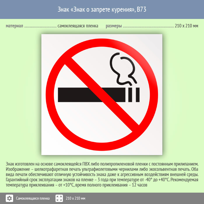 Знак «Знак о запрете курения», B73 (пленка, 210х210 мм) в Великом Новгороде купить