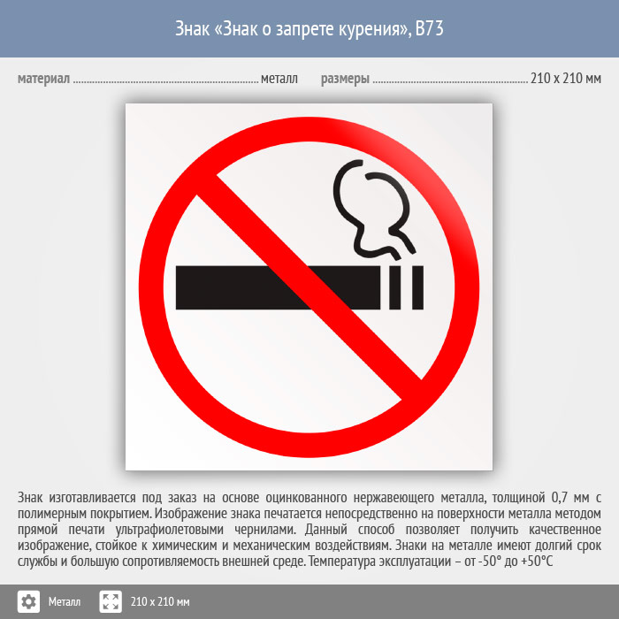 Знак «Знак о запрете курения», B73 (металл, 210х210 мм) в Великом Новгороде купить