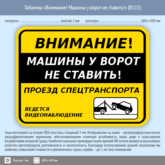 Табличка «Внимание! Машины у ворот не ставить!», B115 (пластик, 600х400 мм) в Великом Новгороде купить