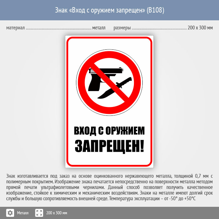 Знак «Вход с оружием запрещен», B108 (металл, 200х300 мм) в Великом Новгороде купить