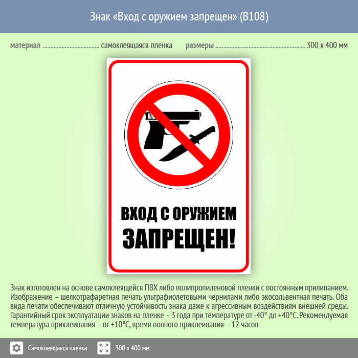 Знак «Вход с оружием запрещен», B108 (пленка, 300х400 мм) в Великом Новгороде купить