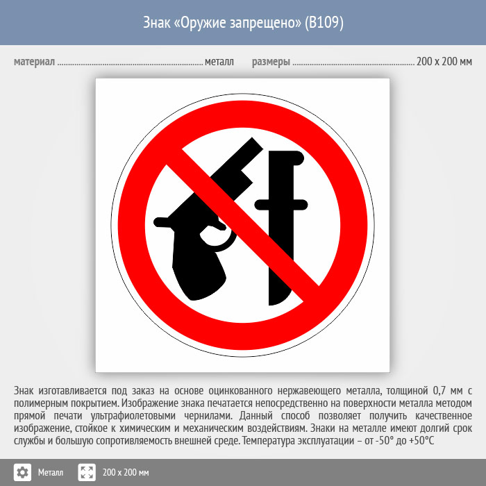Знак «Оружие запрещено», B109 (металл, 200х200 мм) в Великом Новгороде купить