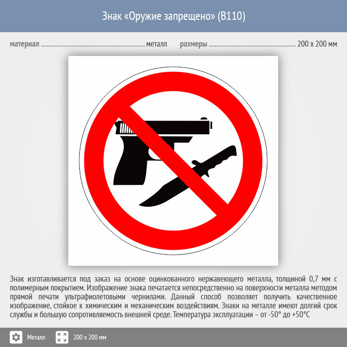 Знак «Оружие запрещено», B110 (металл, 200х200 мм) в Великом Новгороде купить