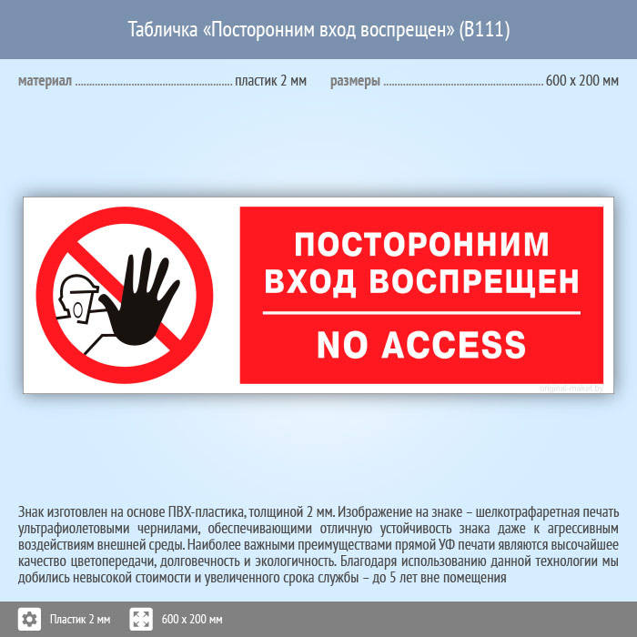 Табличка «Посторонним вход воспрещен», B111 (пластик, 600х200 мм) в Великом Новгороде купить