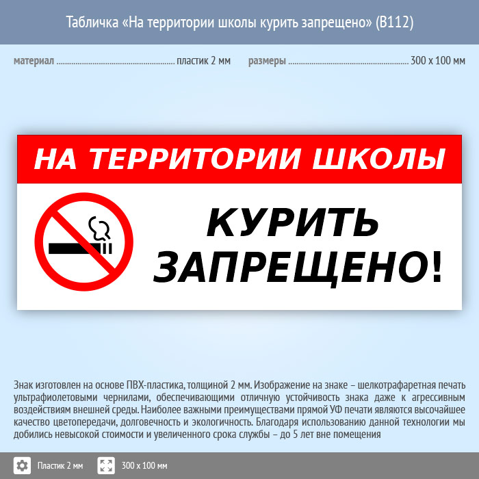 Табличка «На территории школы курить запрещено», B112 (пластик, 300х100 мм) в Великом Новгороде купить