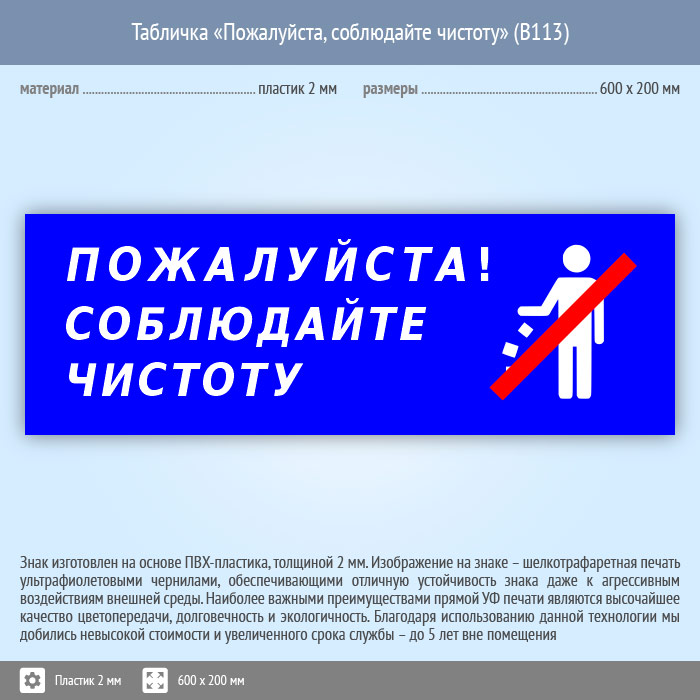 Табличка «Пожалуйста, соблюдайте чистоту», B113 (пластик, 600х200 мм) в Великом Новгороде купить