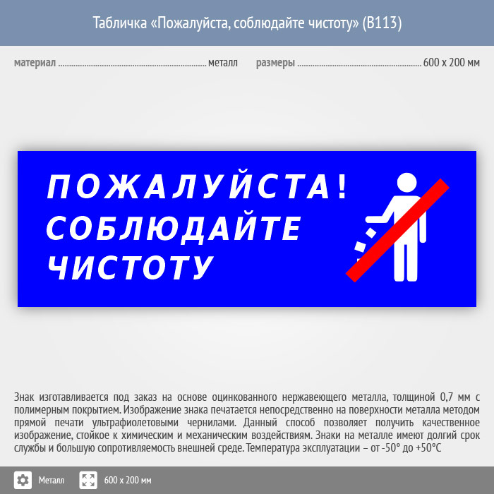 Табличка «Пожалуйста, соблюдайте чистоту», B113 (металл, 600х200 мм) в Великом Новгороде купить