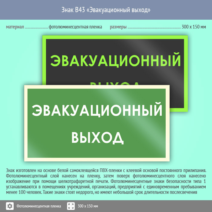 Знак B43 «Эвакуационный выход» (фотолюминесцентная пленка, 300х150 мм) в Великом Новгороде купить