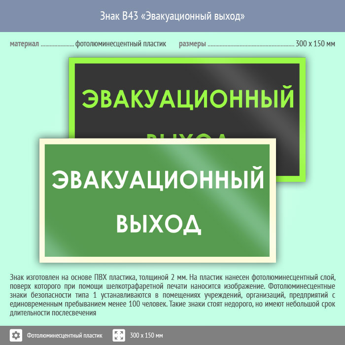Знак B43 «Эвакуационный выход» (фотолюминесцентный пластик, 300х150 мм) в Великом Новгороде купить