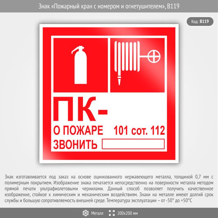 Знак «Пожарный кран с номером и огнетушителем», B119 (металл, 200х200 мм) в Великом Новгороде купить