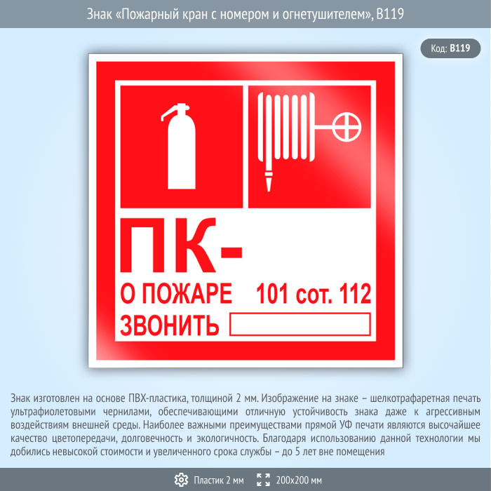 Знак «Пожарный кран с номером и огнетушителем», B119 (пластик, 200х200 мм) в Великом Новгороде купить
