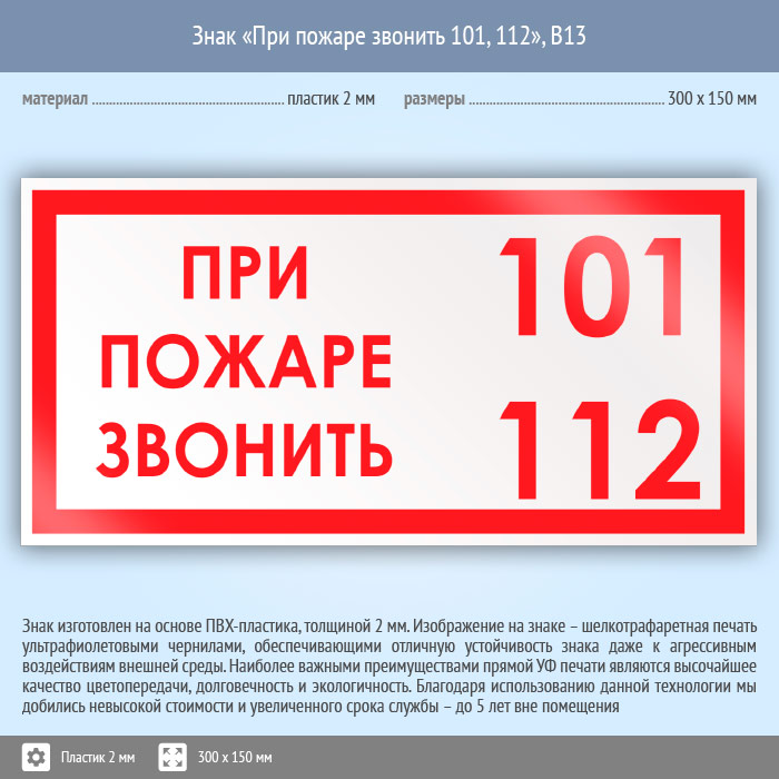 Знак «При пожаре звонить 101, 112», B13 (пластик, 300х150 мм) в Великом Новгороде купить