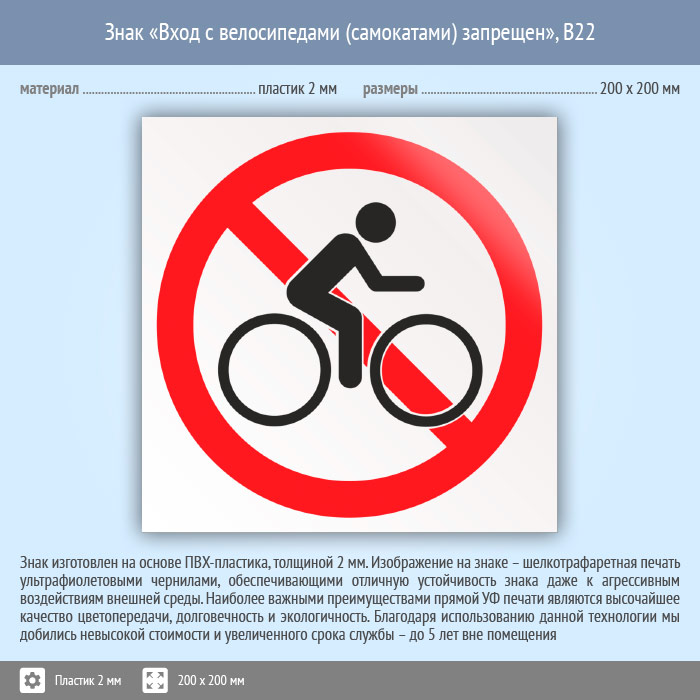 Знак «Вход с велосипедами (самокатами) запрещен», B22 (пластик, 200х200 мм) в Великом Новгороде купить